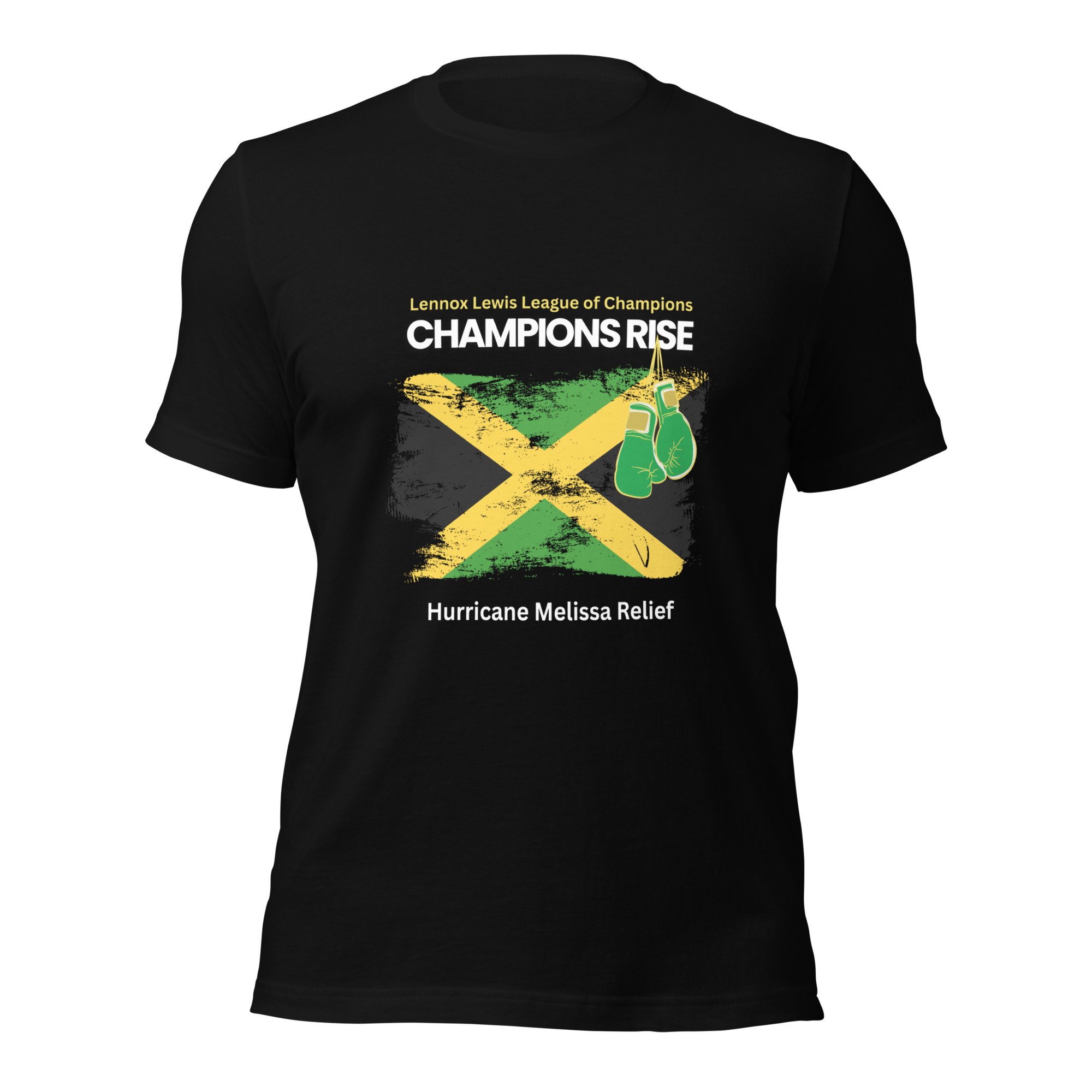 This Champions Rise shirt is more than apparel; it’s a statement of strength, unity, and hope. Every purchase supports the Lennox Lewis League of Champions Hurricane Melissa Relief Fund, providing direct aid to families and youth programs affected by the storm.