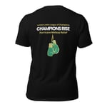 Featuring a bold “Jamaica” heart design on the front and the official Champions Rise Hurricane Melissa Relief graphic on the back, this shirt honors strength, unity, and recovery in the face of devastation.